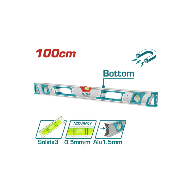 TOTAL TMT210086M Industrial Spirit Level 100cm – Three Vials with Horizontal, Vertical, and 45° Angle Measurements, Aluminum Frame, Strong Magnets