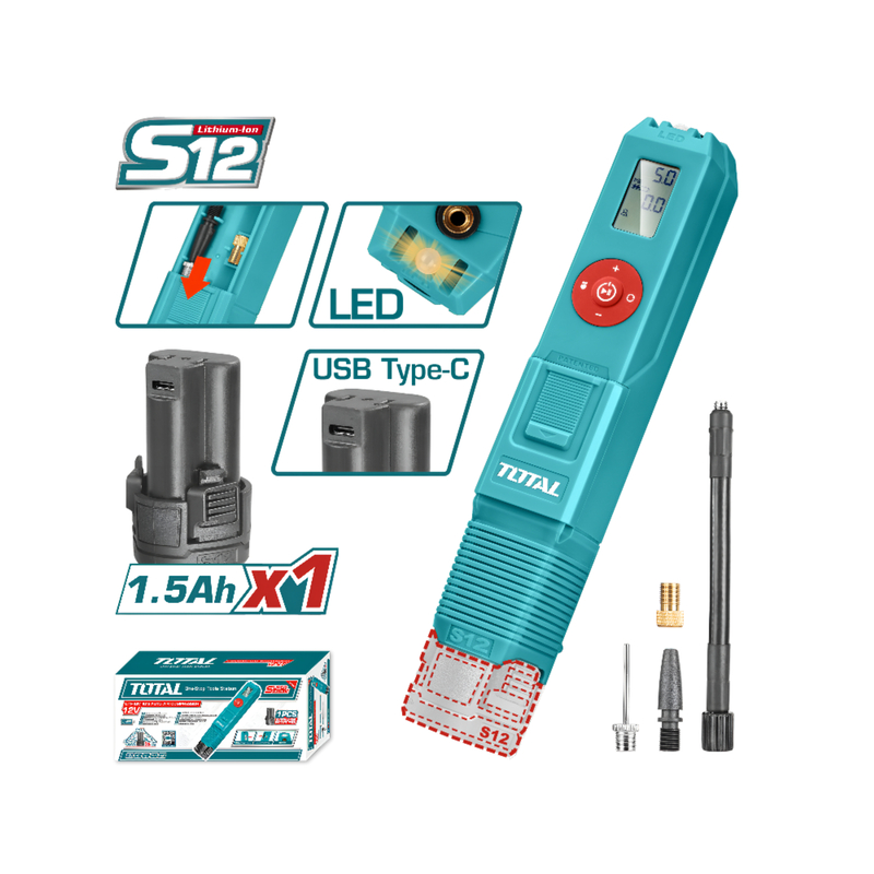 Compact and Lightweight Design: Weighing just 1.3 kg and measuring 18.5 x 8 x 7 cm, the Total Lithium-Ion Auto Air Compressor is both compact and lightweight. Its portable size makes it easy to store in your car or garage, ensuring that you always have it on hand when you need it.