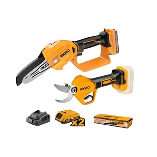 Ingco 20 volt 5 inch saw cutting kit with tree sawVoltage:20VWith 1pcs Lithium-ion gauge straight shear(CSSLI20308)With 1pcs Lithium-Ion pruner saw(CGSLI20581)Lithium-ion gauge straight shear(CSSLI20308)Brushless MotorVoltage:20VCutting diameter:20/30mmLithium-Ion pruner saw(CGSLI20581)Voltage:20VBar length:5"(13cm)Chain speed: 5m/sInclude:1 Pcs oil mixing bottle1 Pcs sharping stone1 Pcs saw chain1 Pcs chain saw bar1 Pcs wrench2 Pcs 2.0Ah battery pack(FBLI20011)1 Pcs charger(FCLI2001)Charge volts: 220-240V~50/60Hz