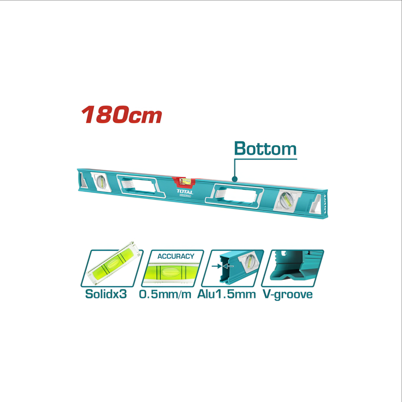 TOTAL TMT218086 Spirit Level 180cm – Precision Double-Sided Milled Level with V-Shape Slot for Round Surface Measurement & High Accuracy Vials for Construction & Professional Use