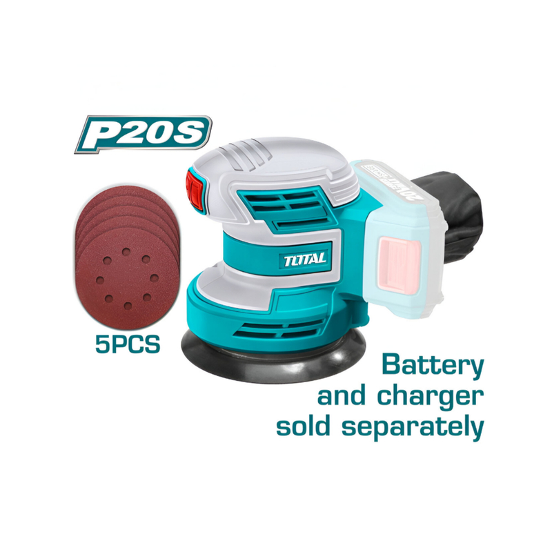 Total TROSLI2001 Li-ion Random Orbit Sander โ 20V, 10,000rpm, with 5 pcs Sanding Papers and Ergonomic Design