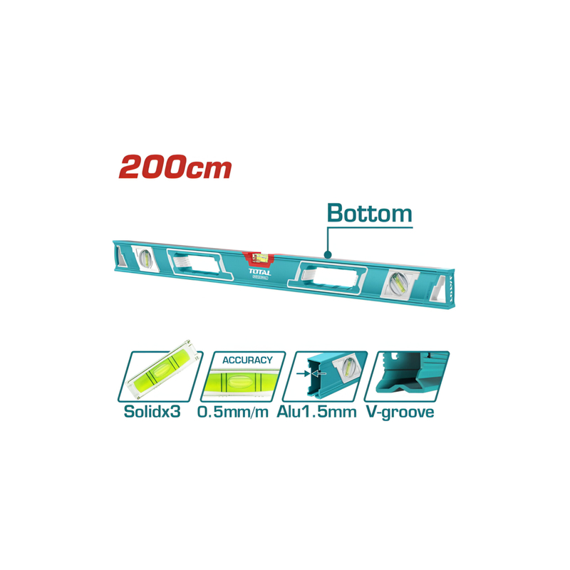 TOTAL TMT220086 Spirit Level 200cm – Precision Double-Sided Milled Level with V-Shape Slot for Round Surface Measurement & High Accuracy Vials for Professional Use