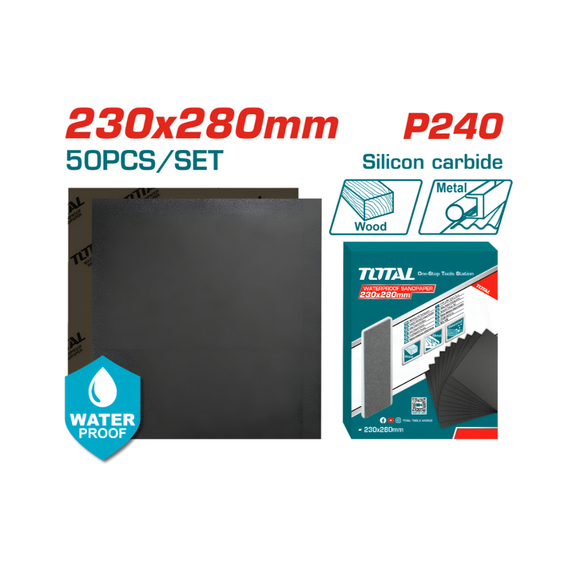 TOTAL Waterproof Sandpaper (P240) – 50 Pcs/Set, Silicon Carbide, Ideal for Wood, Metal, Plastic, Glass, and More – 230x280mm