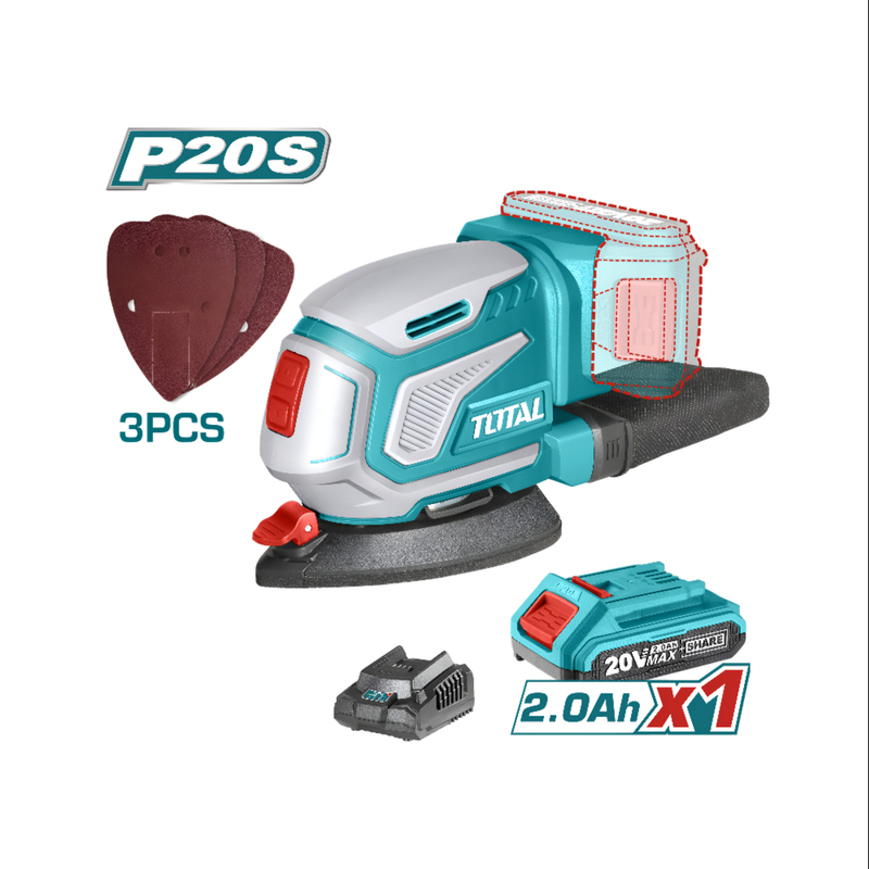 Total TTX-TDSLI20511 Lithium-Ion Palm Sander โ 20V, 13,000rpm, with 2.0Ah Battery, Charger, Sandpapers, and Color Box Packaging