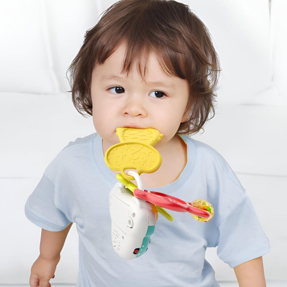 โ โข 3 coloured keys (one spins, one rattles, one has teething / tactile surface)