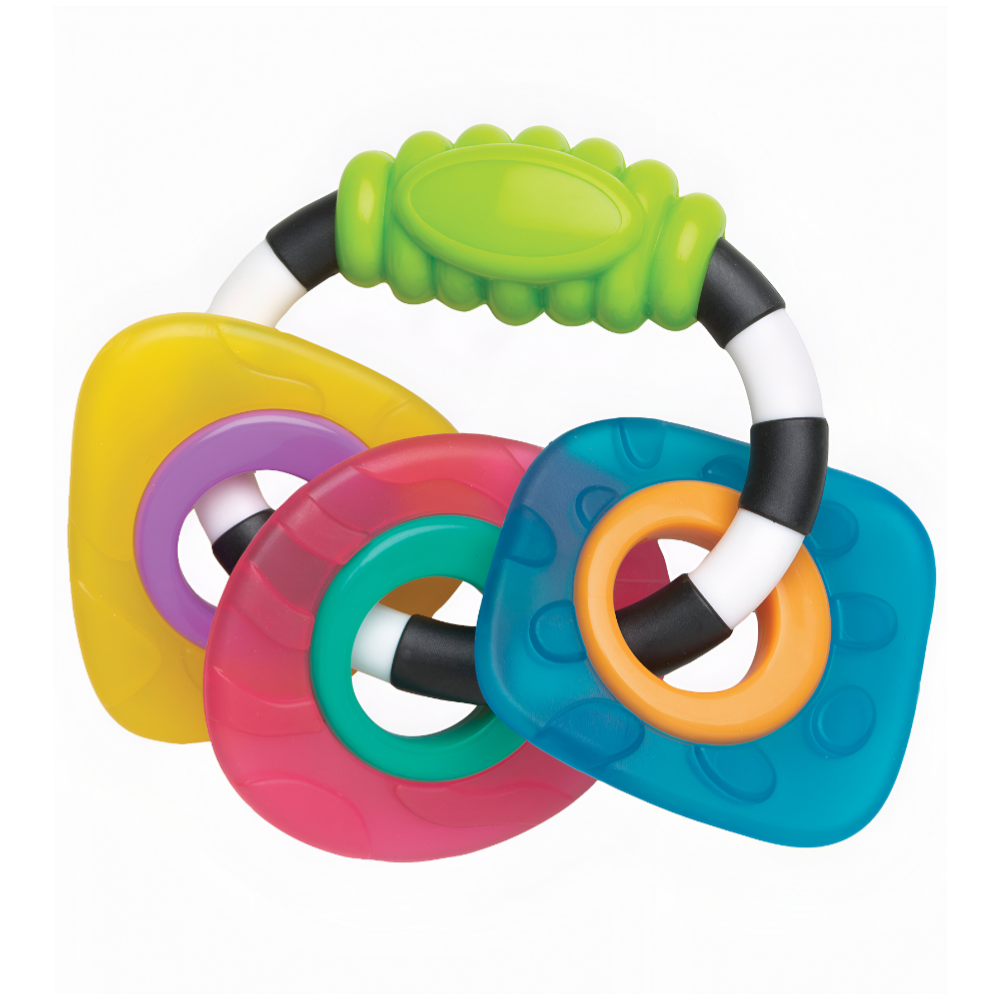 Design: Ergonomic handle with soft textured surfaces and gentle rattle inside
