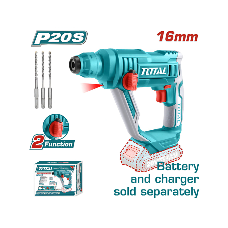TOTAL TRHLI1601 Li-ion Rotary Hammer – 20V, 16mm Concrete Drilling Capacity, 1.5J Impact Force, Free 3 Pcs Hammer Drill Bits Included