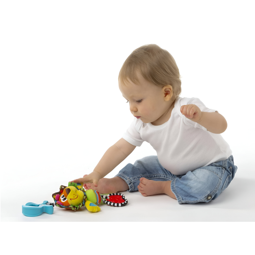 SFX-182853Roaryโs soft body, crinkly feet, and jingling rattle stimulate auditory and tactile awareness, while his colorful mane and playful patterns capture visual attention. His dingly dangly limbs add movement and fun, encouraging babies to reach, pull, and play โ all while strengthening their coordination and motor skills.